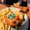 Crispy breaded chicken served with a side of chips.